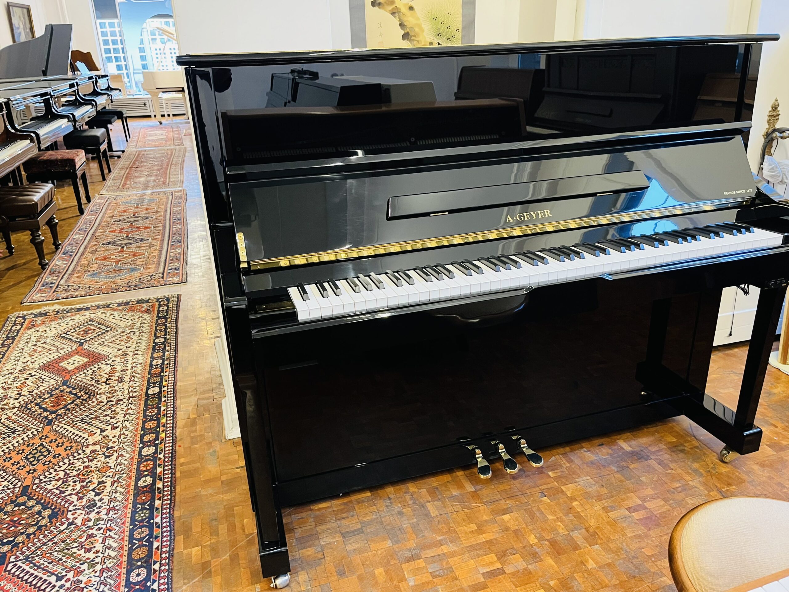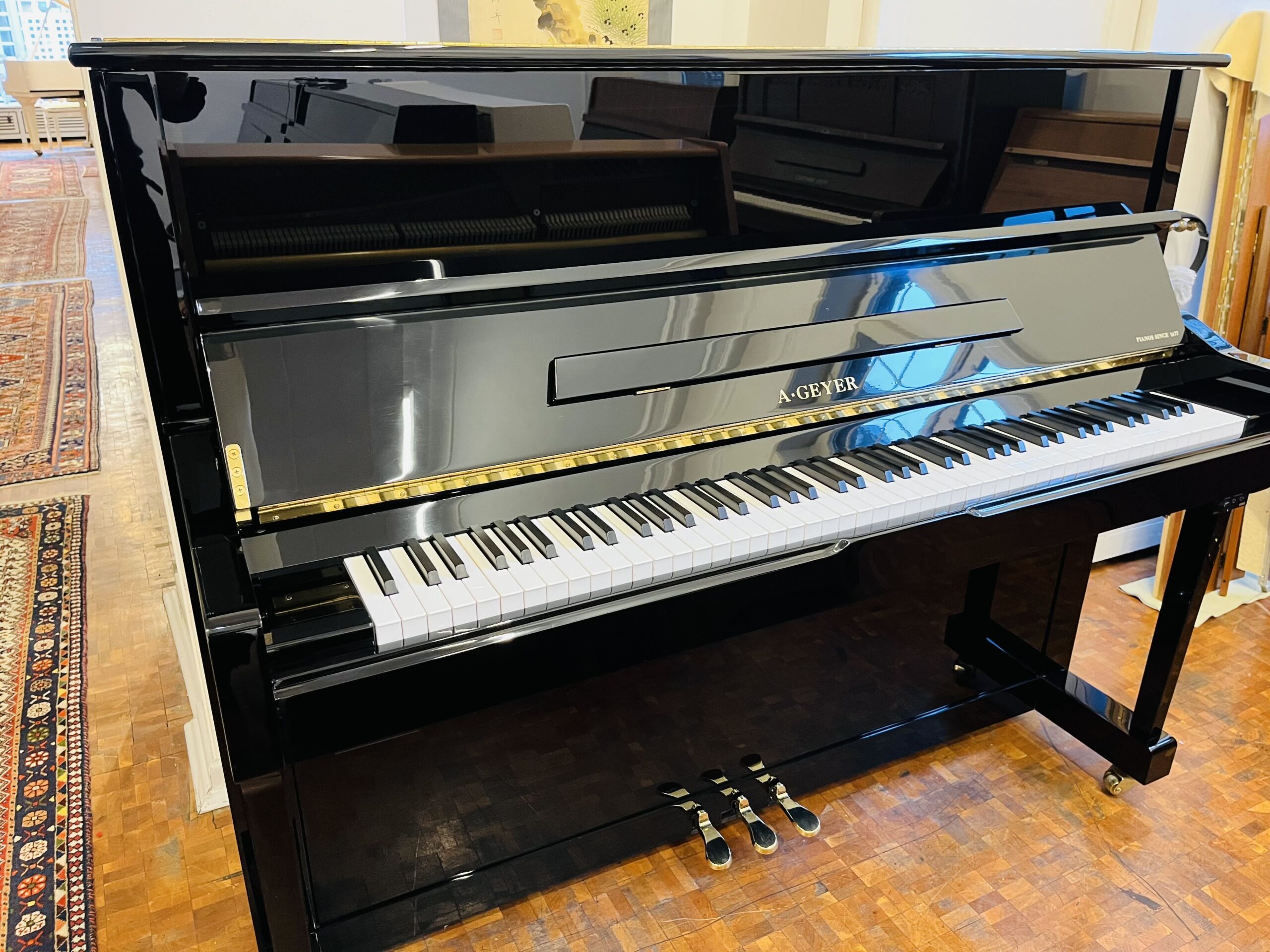 Dieses schwarz polierte Klavier in zeitlos klassischer Form fügt sich in alle Stilrichtungen ein. Die Baugrösse von 123 cm bietet auch Pianisten mit langen Beinen genügend Platz (Beinfreiheit 65cm).