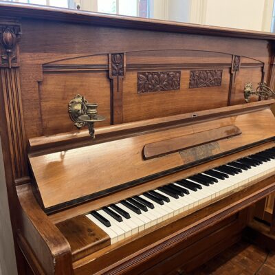 Braunes Nostalgie-Klavier mieten: Dieses Klavier aus dem Baujahr 1990 ist ein Remake eines alten Klavieres und zeichnet sich durch ein aufwändiges Gehäuse aus mit handgefertigten Kerzenleuchtern aus Messing. Lieferung nur an Erdgeschoss-Standorte.