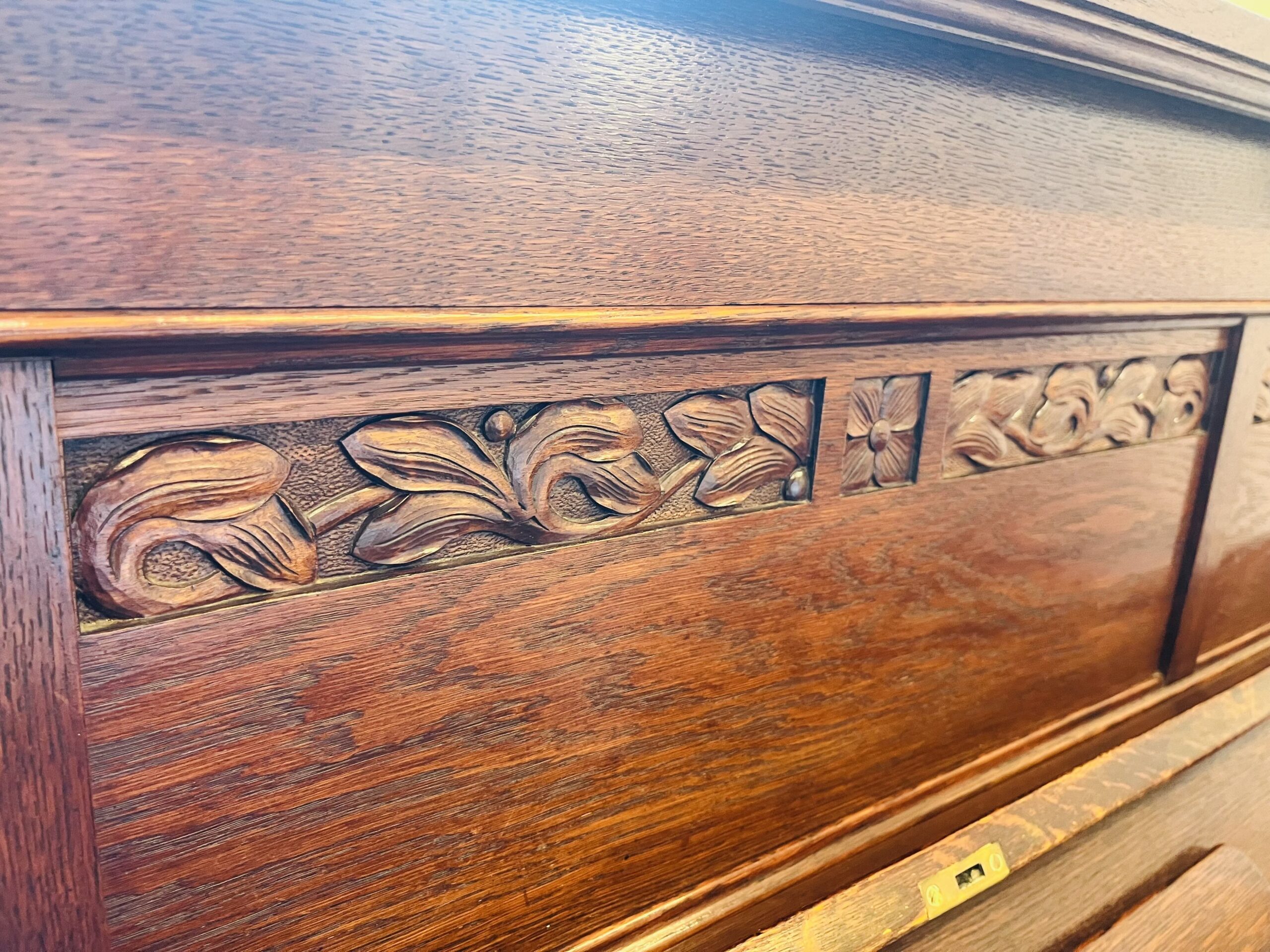 Nostalgie-Klavier in Holzoptik mieten: Dieses antike Klavier bietet eine gute Kombination aus romantischem Klang und nostalgischer Optik mit Blumenornamenten. Lieferung vorzugsweise nur an Erdgeschoss-Standorte.